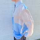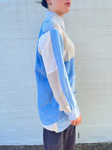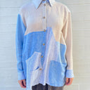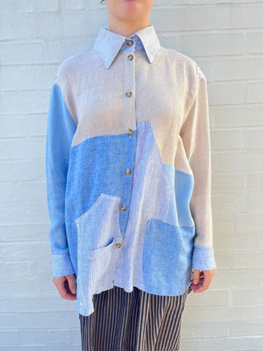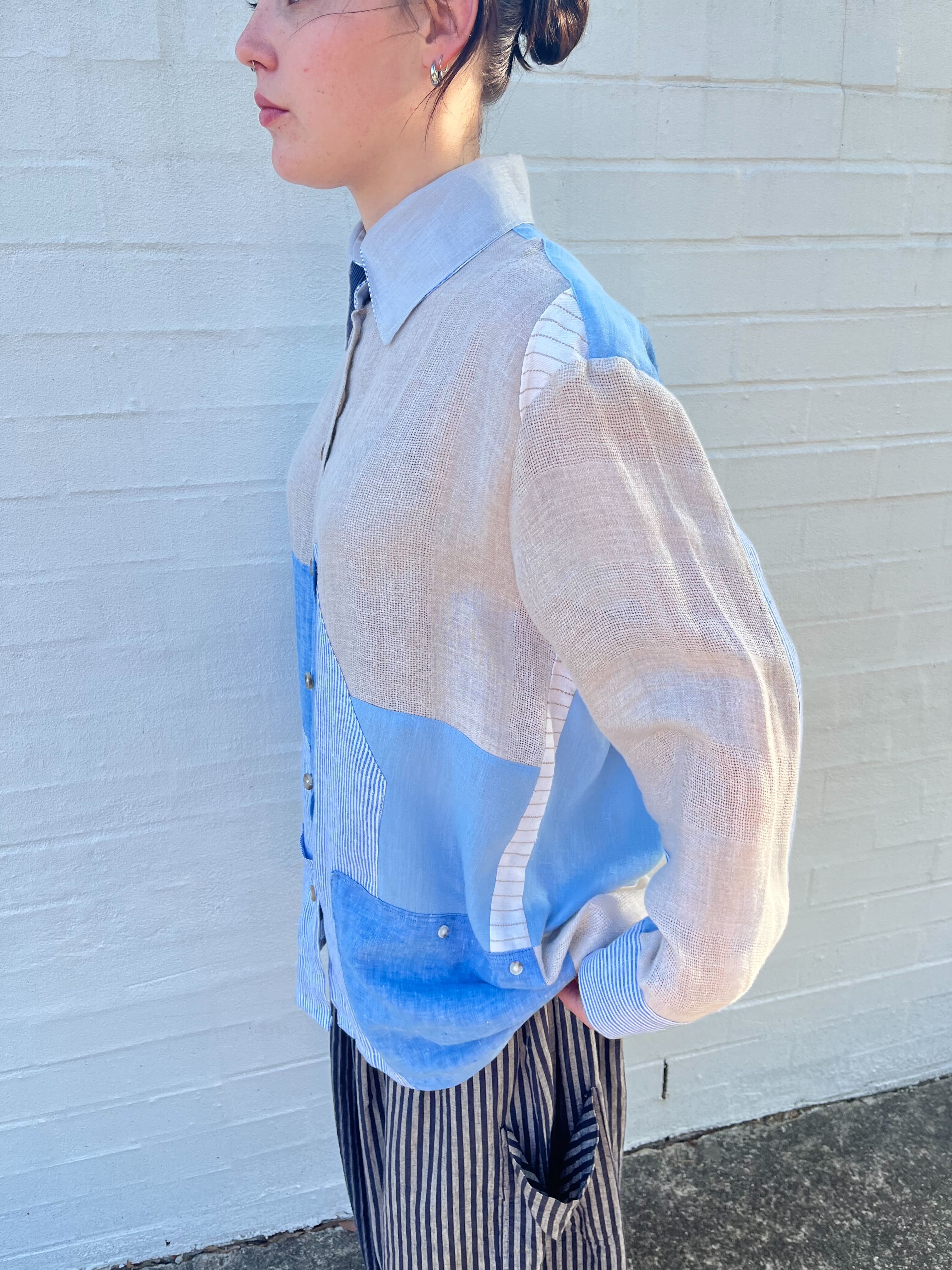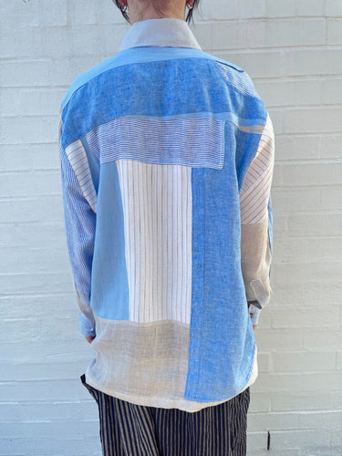 This shirt is made from reclaimed linen garments that were once considered unsellable, pieces with stains, holes, or production flaws. It deconstructs each garment and rescues the usable fabric. During the pattern-making stage, every patch is thoughtfully placed to create an organic, free-flowing patchwork layout. The finished piece is 100% linen, one-of-a-kind, and built entirely from material that otherwise would have been discarded.