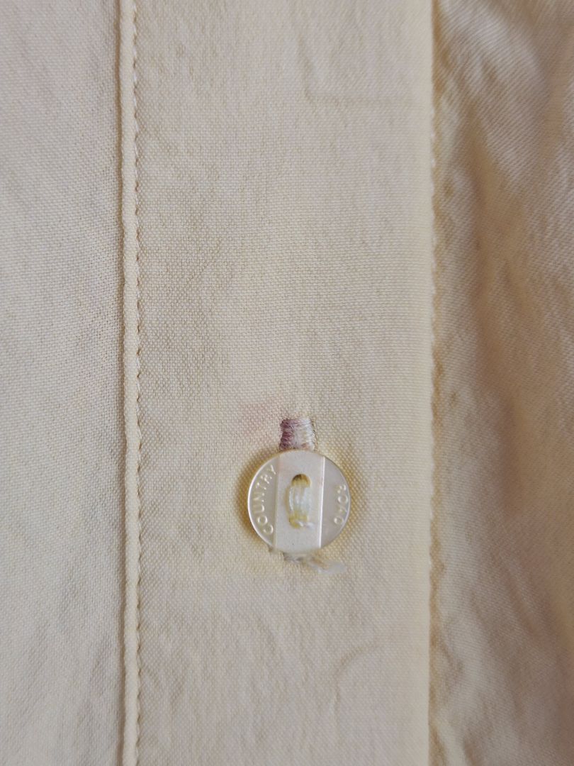 Loose thread on left cuff button, very small minor mark on 5th from the top button hole.