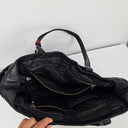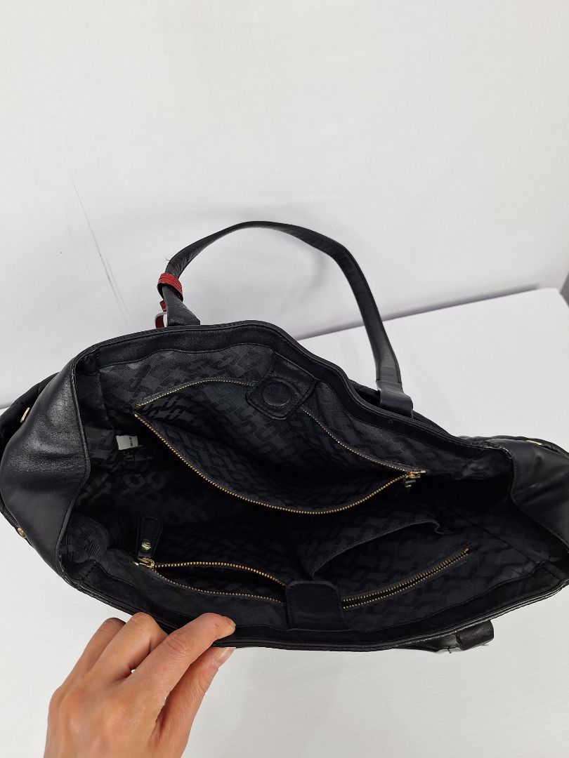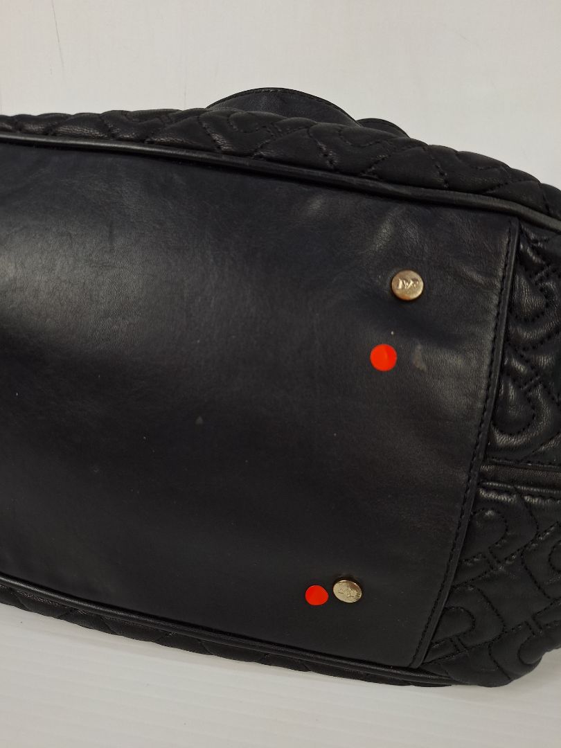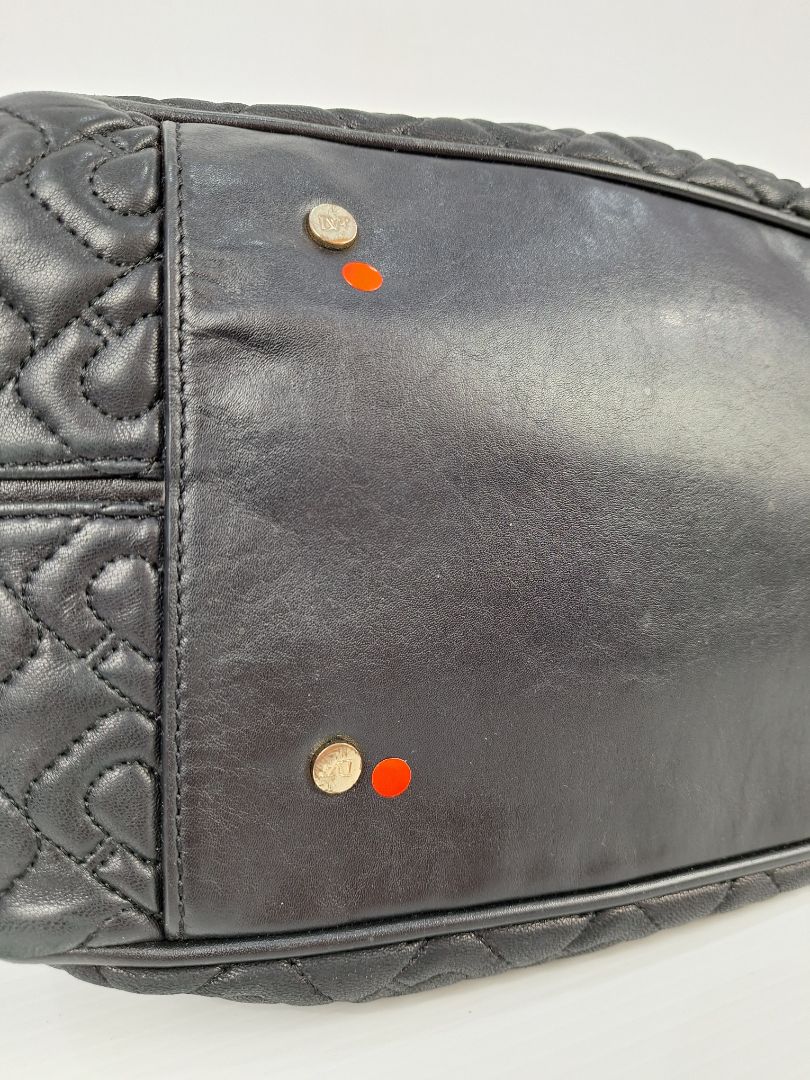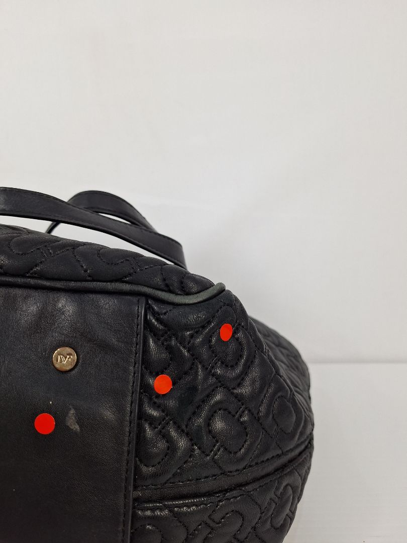 Scattered marks, hardware tarnished, piped edge showing wear in places, minor frayed stitching on handles, red tag strap attachment has a split.