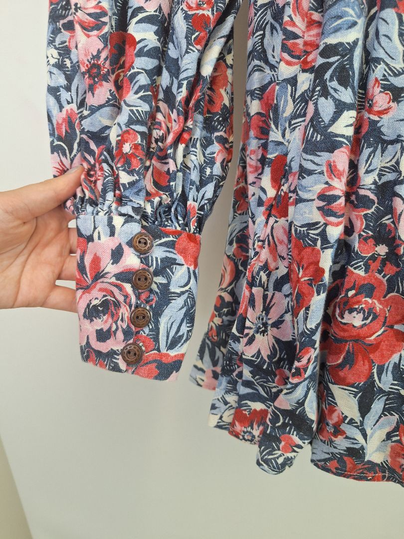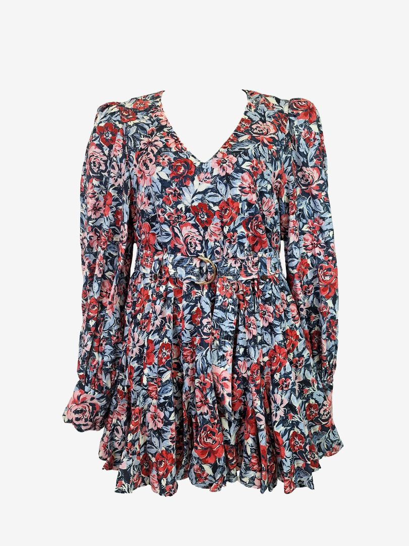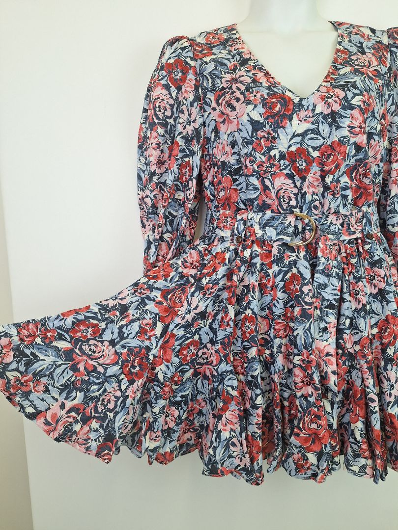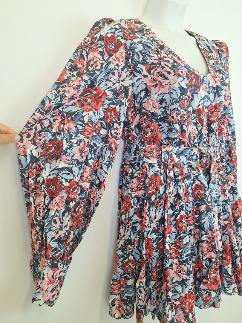 Kate Ford Painted Floral Linen Long Sleeve Belted Mini Dress Size 12