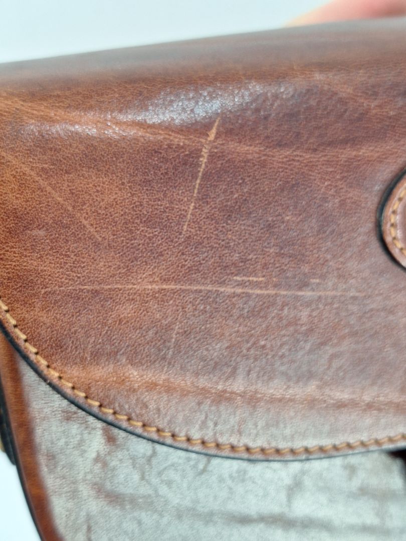 Scattered scratches and marks, lightly marked internal lining, gold hardware slightly tarnished.