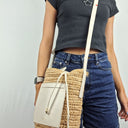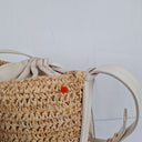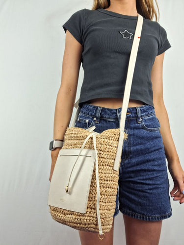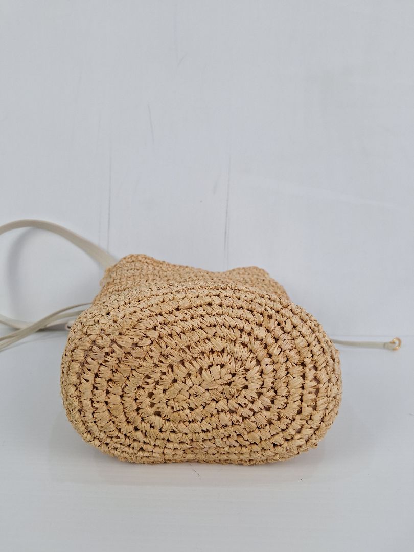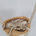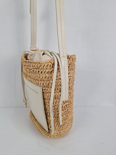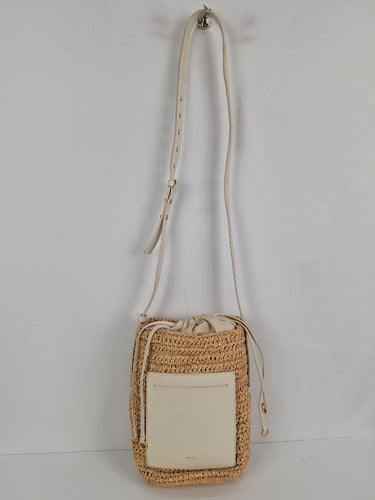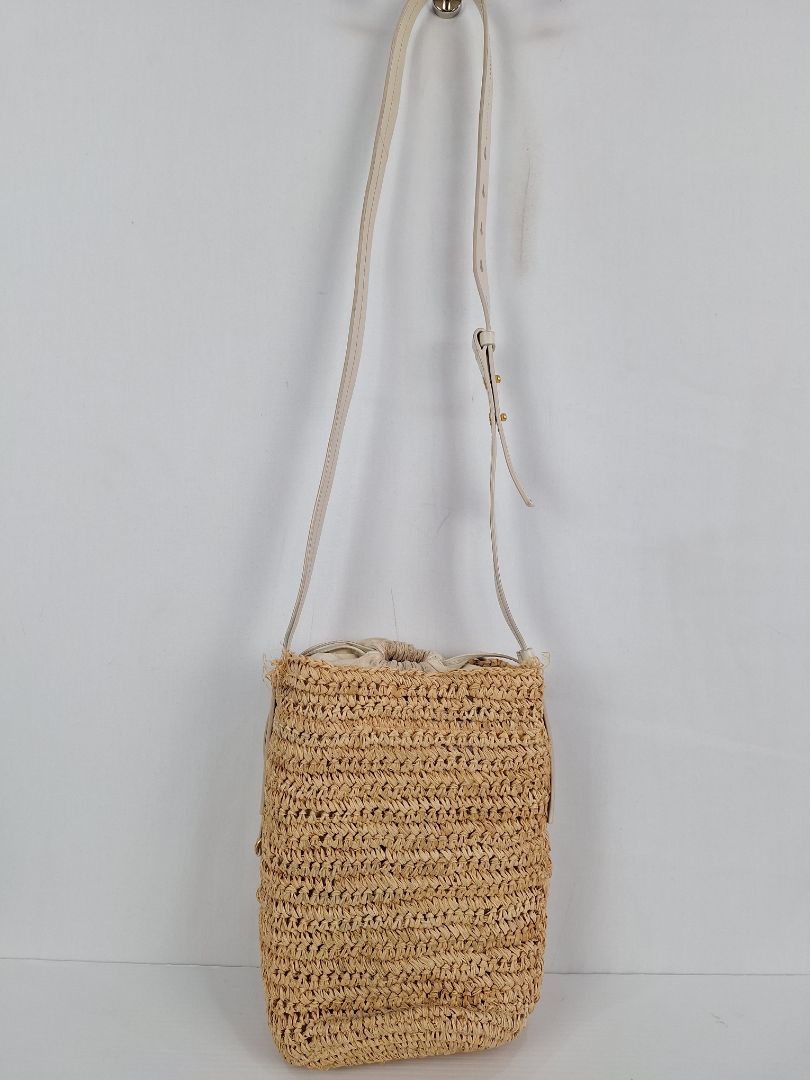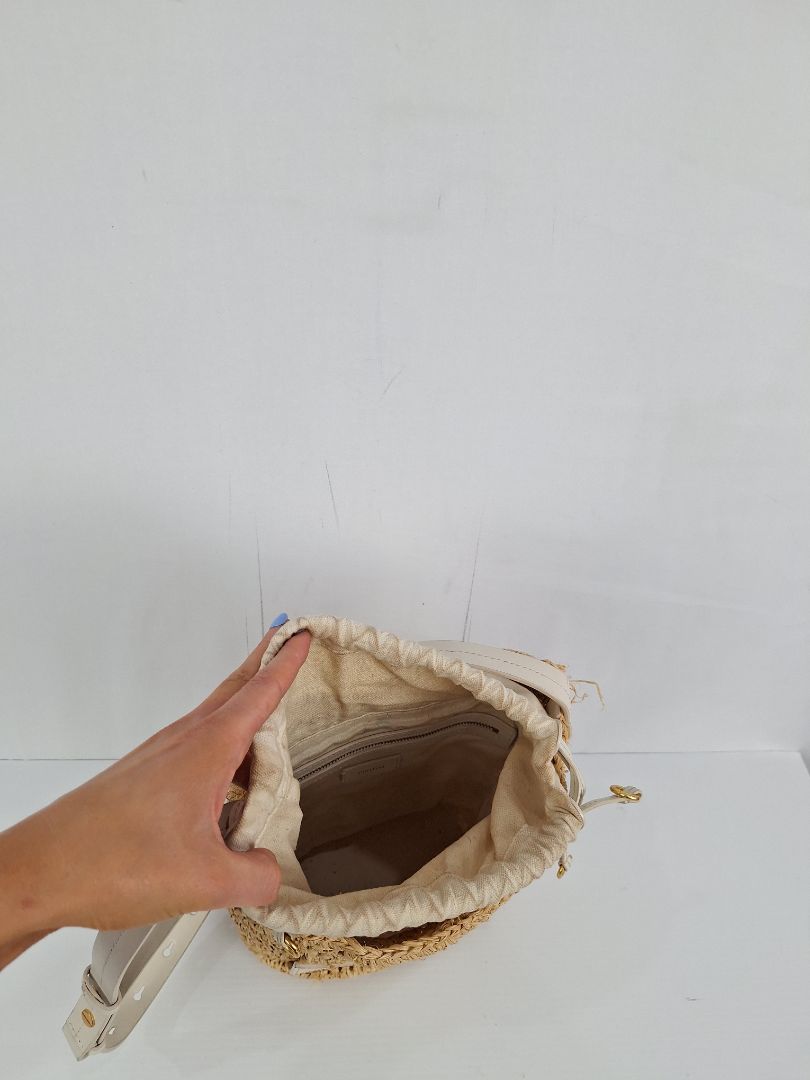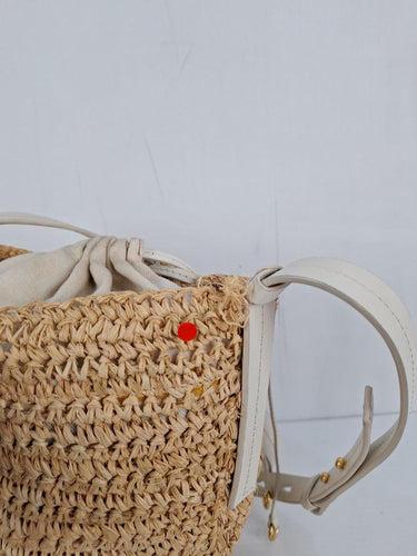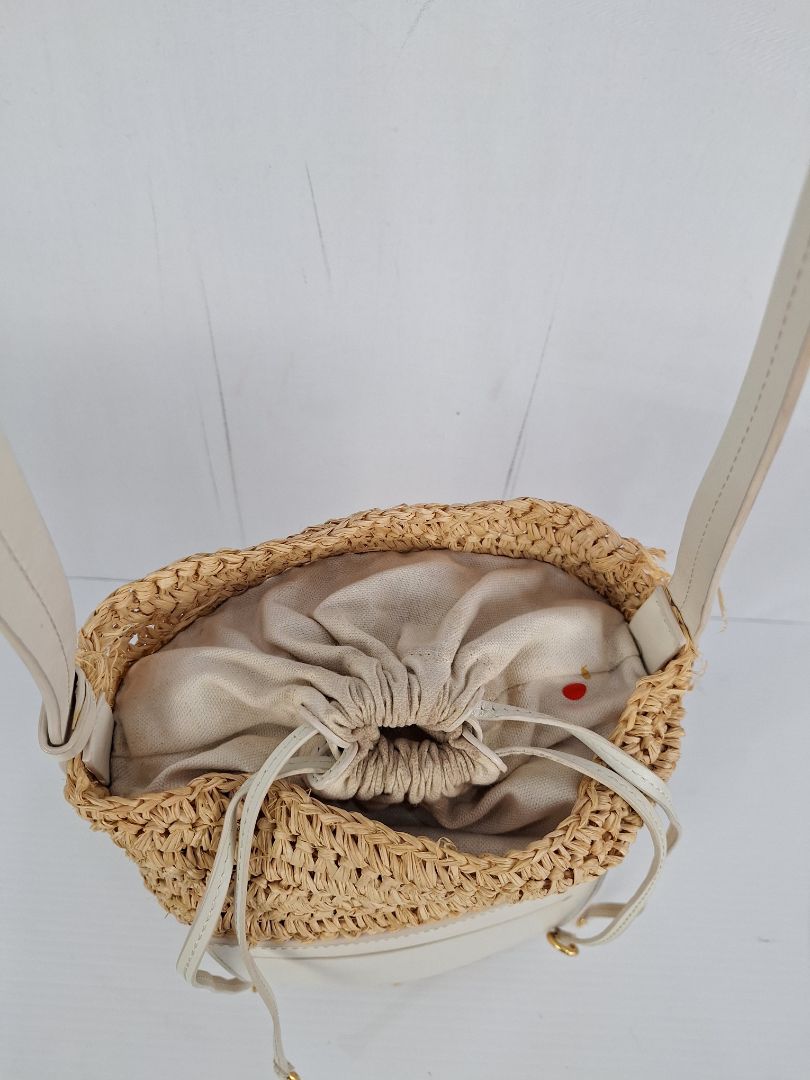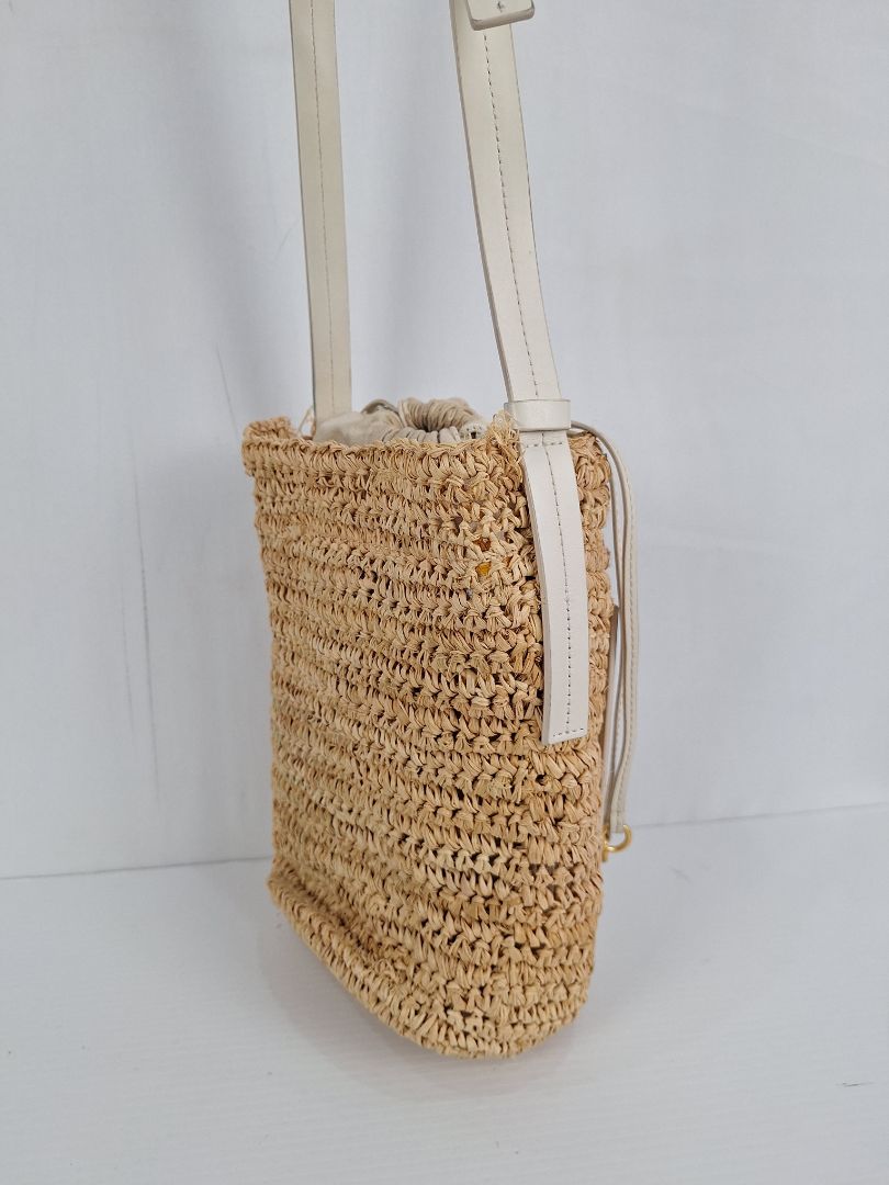 Discoloured marks on lining. Sections of weave coming undone, particularly around strap handles. Some marks on outer leather.