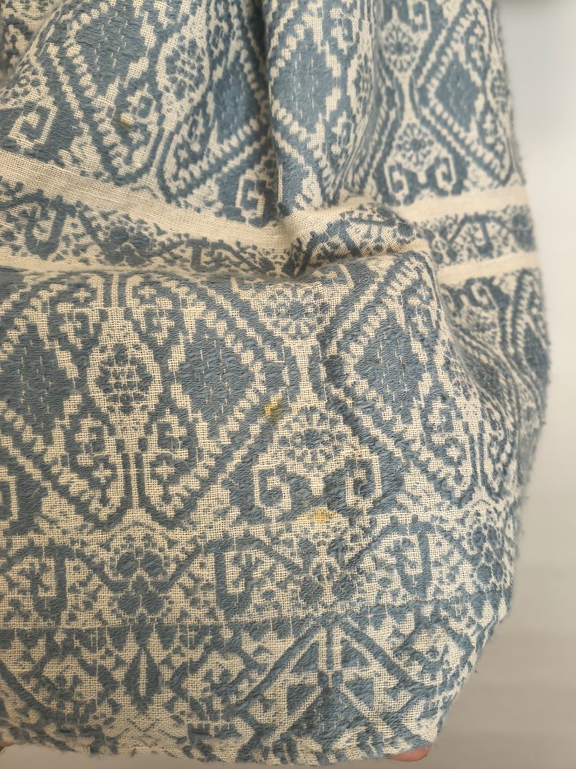 Scattered discoloured marks on bottom section, discoloured mark around bust. Light pilling / wear to blue embroidery. No size tag, please refer to measurements. Photographed on a size small mannequin.